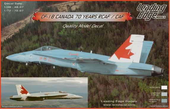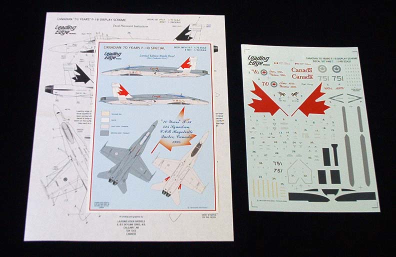 Decals provided for two complete CF-18 Hornets including all stencils, leading edge protectors and false canopy decals.